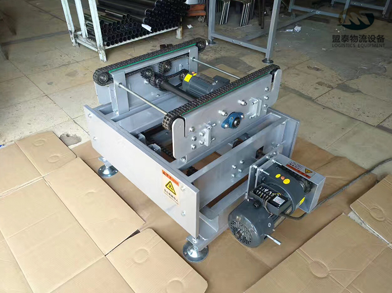 链条机主要由机架组件、驱动总成、支腿、输送链和护栏组件等组合而成。驱动架上的电机经传动轴组件带动两边的输送链,输送链沿机架上的托条行走。在驱动架上配备链条涨紧装置。机架材料可选碳钢或铝合金。